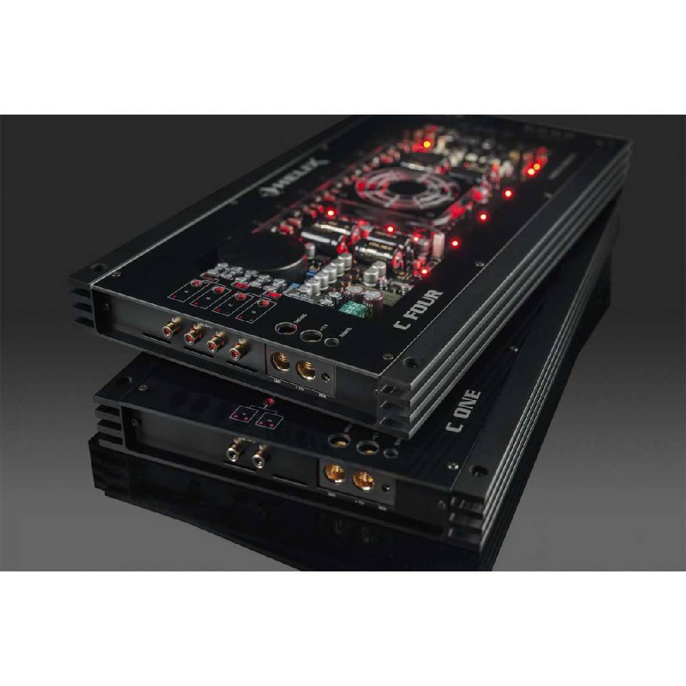 • قلب تپنده HELIX سی فور یک مدار تقویت‌کننده کلاس AB است که برای دستیابی به کمترین اعوجاج ممکن طراحی شده است. مهندسان هلیکس از 32 عدد ماسفت (MOSFET) قدرت که به صورت دستی انتخاب و جفت‌سازی شده‌اند (Hand-selected)، استفاده کرده‌اند تا تقارن کامل در سیگنال خروجی تضمین شود. این دقت وسواس‌گونه باعث می‌شود که آمپلی‌فایر ضریب میرایی (Damping Factor) خیره‌کننده‌ای بیش از 1000 داشته باشد که به معنای کنترل مطلق بر حرکت مخروط بلندگوهاست.